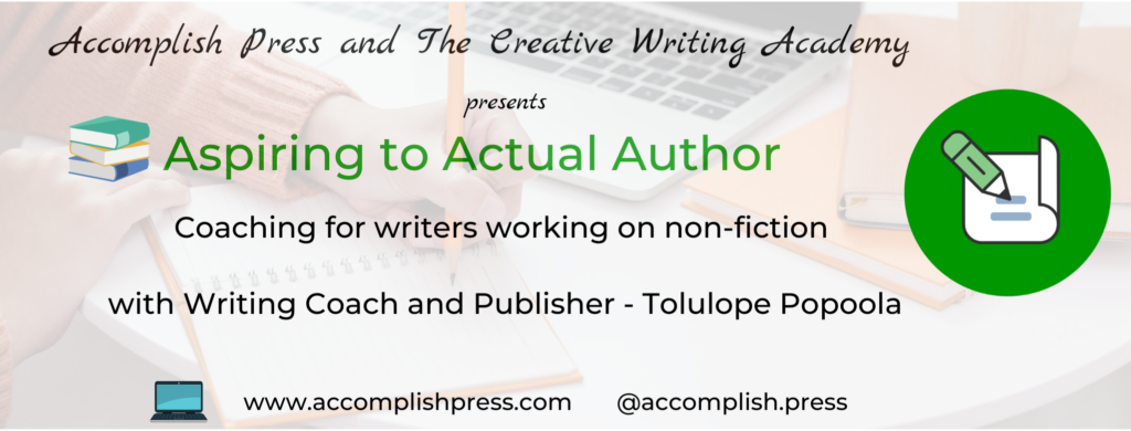My name is Tolulope Popoola and I’m your “get unstuck” Writing Coach and Publishing Consultant at Accomplish Press. I help aspiring authors to overcome their obstacles, clear their doubts and reconnect with their creative side, so that they can finally write and publish the book within them! I also help with structuring and publishing manuscripts after they’re done.